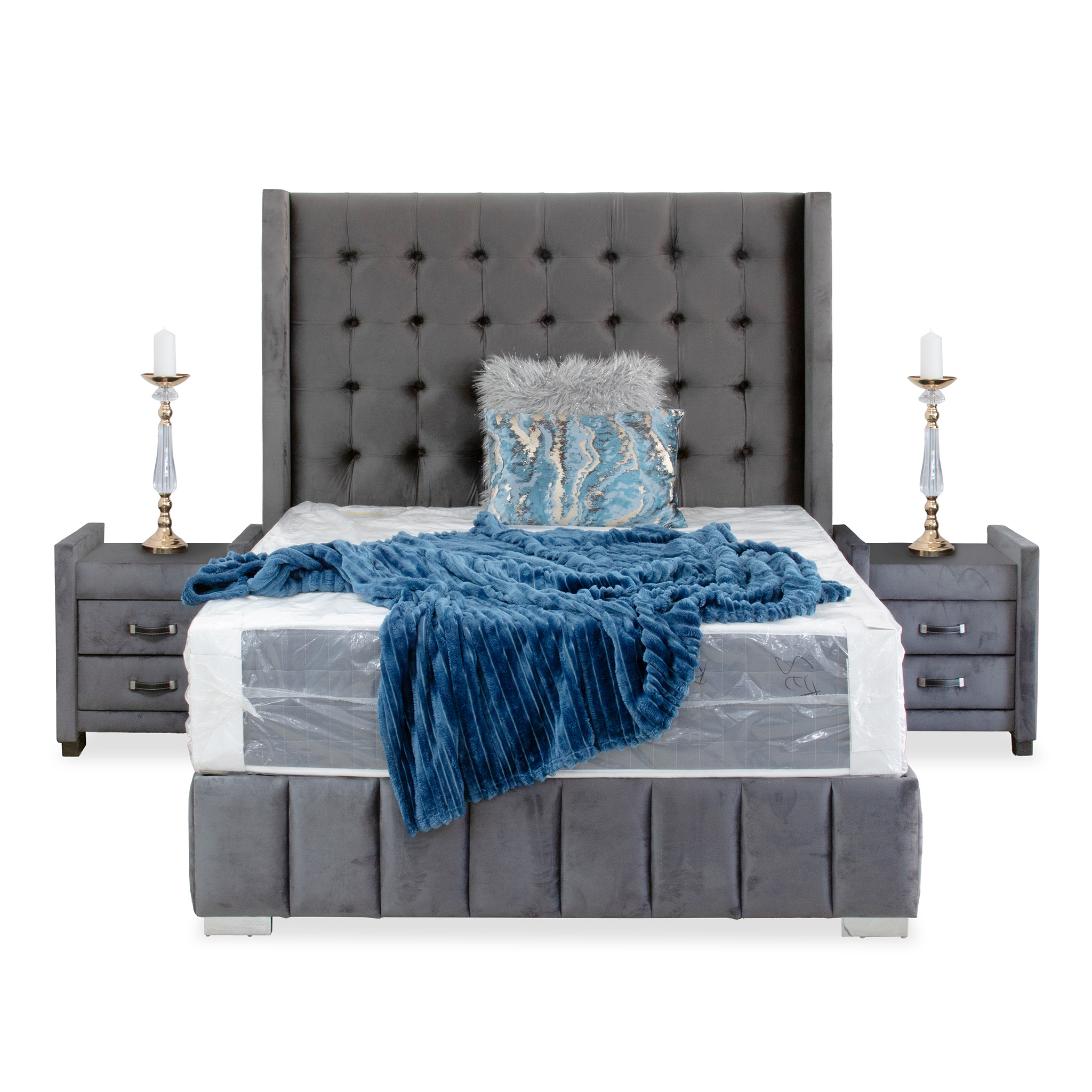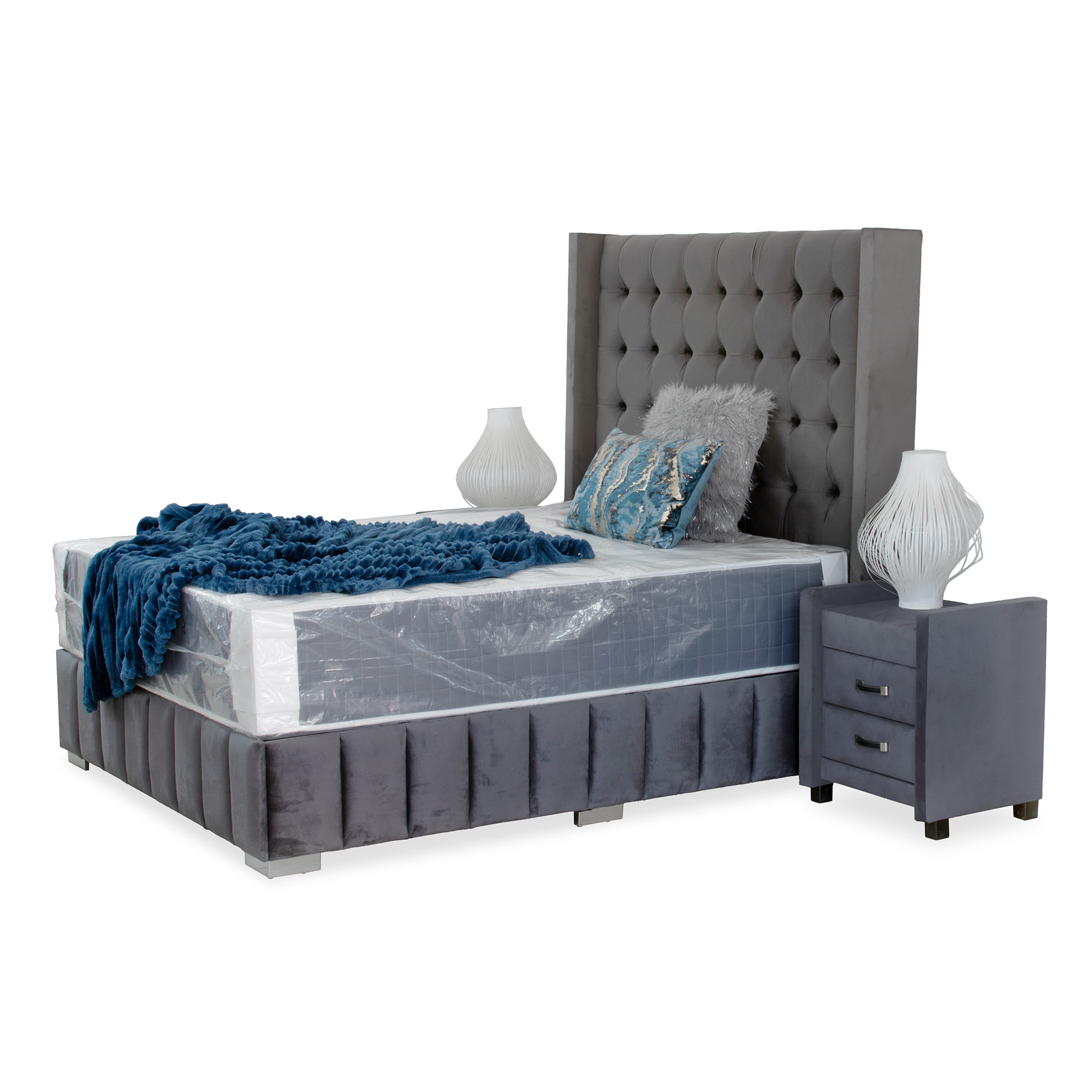 / Cubo Button Wing Headboard Queen Grey Velvet Fabric