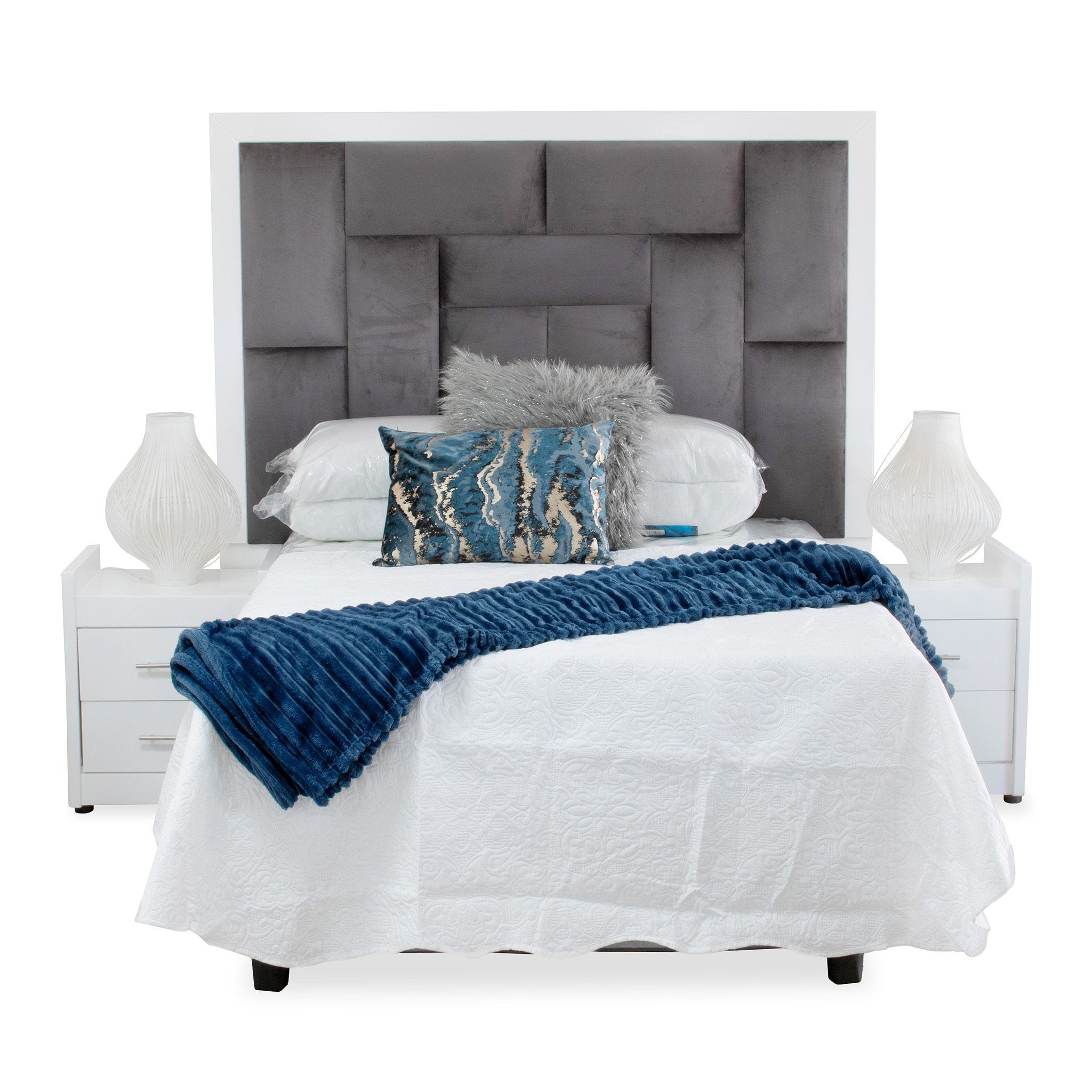 Zanzibar Queen Headboard White Wood Grey Velvet (Pedestals Not included)